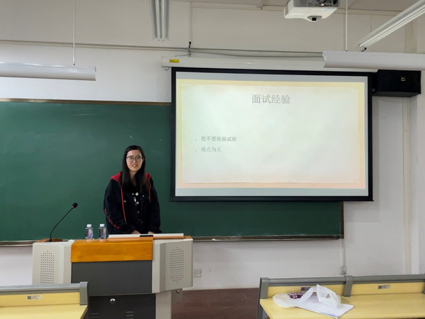 最后,她为同学们提出了一些建议:心态很重要,不要与别人做比较,在准备的过程中要放平心态,注重学习的效率,在保证学习效率的前提下,她认为一至两个月每天六小时左右的复习时间已经足够。