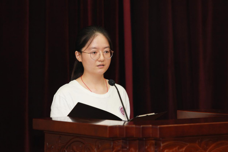 随后,2020级本科生代表张义美同学进行了发言。她说:“过去的一年中。我在方方面面体会到了学院的人文关怀。”在发言中,张义美提到,自己初入大学时,面对难度陡然提升的专业课程迷茫无措。班导师们特意为学生们解压,在学业上倾囊相授,在情绪上予以慰藉;辅导员老师也到宿舍与学生们进行谈心,为大家排忧解难;在学院朋辈帮扶活动中,热心的学长学姐们也不吝地给予建议和帮助。种种收获、种种感动,未来三年,相聚于此。