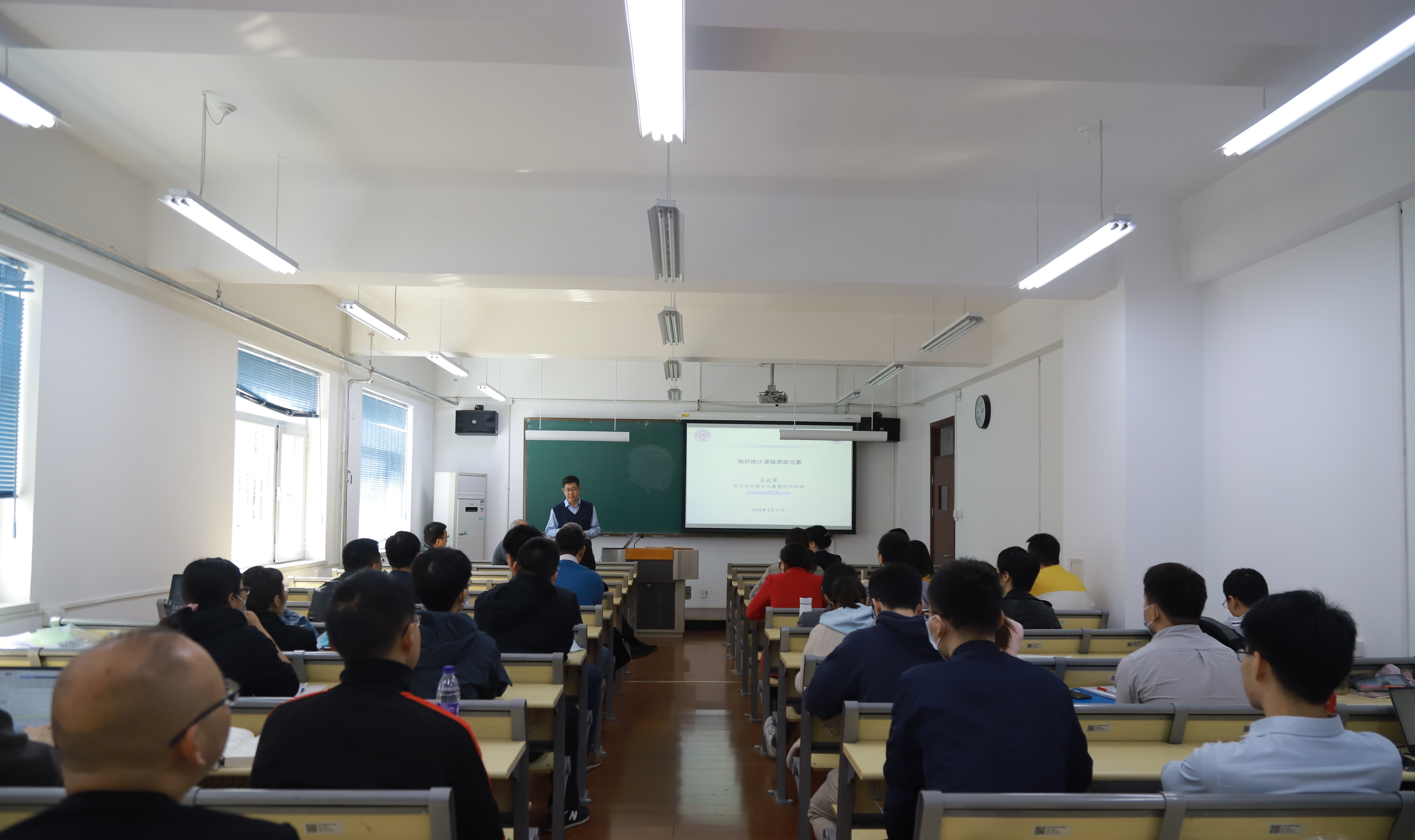 本次讲座以《南开统计课程思政元素》为题,王兆军教授从学校、学科、课程三个层面深入挖掘具有南开特色、统计学科特色、统计课程特色的思政元素,并进行生动的分享。