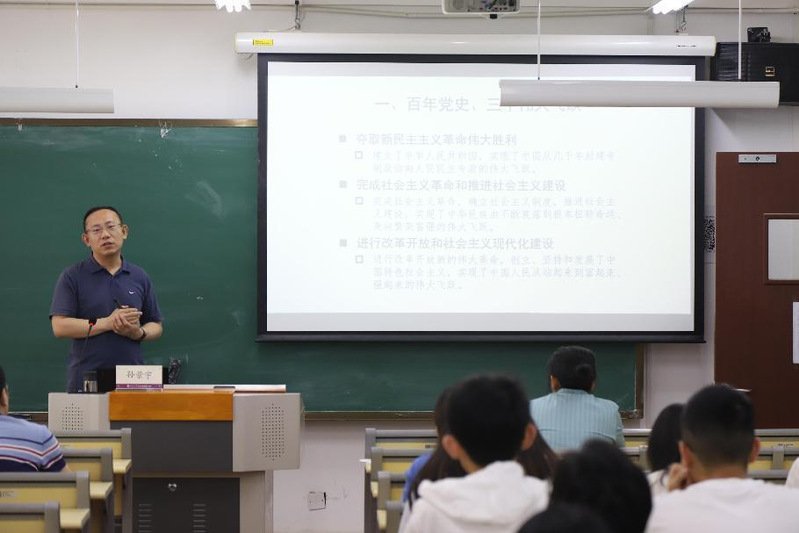 首先,孙景宇教授带领师生回顾百年党史,通过讲述三个伟大飞跃,指出中国特色社会主义进入新时代,中国进入新发展阶段,师生应胸怀两个大局,一个是中华民族伟大复兴的战略全局,一个是世界百年未有之大变局,用全面、辩证、长远的眼光看待国内外形势变化,认清规律、识变应变。同时,孙景宇教授通过生动丰富的案例,深刻阐述数字经济对产业变革的影响,为师生讲解了我国新时代新阶段面临的战略机遇和风险挑战,通过宏观理论与微观实例的有机结合,让师生对把握时代机遇、发挥专业所长的重要意义有了更加清晰的认知。