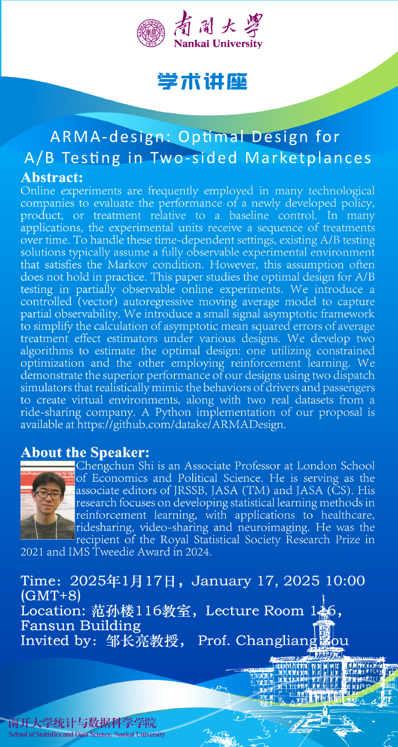 ARMA-design: Optimal Design for A/B Testing in Two-sided Marketplances(Chengchun Shi)