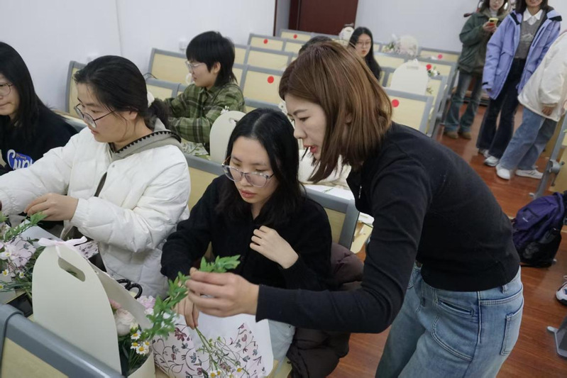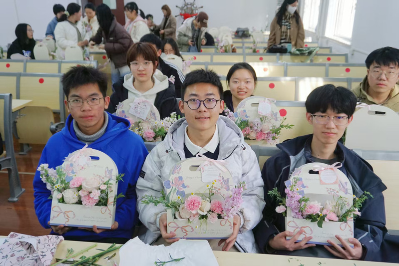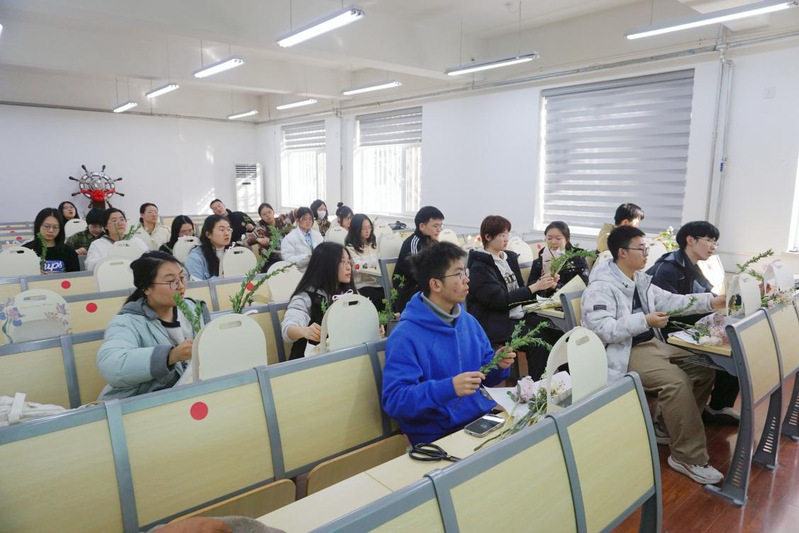 学生们还将自己插好的花束献给女教师,表达了对她们的敬意与祝福,为活动增添了温馨与感动。通过亲手制作花艺作品,同学们不仅提升了艺术修养与审美能力,也在互动中增进了彼此的情谊,进一步营造了学院和谐温馨的氛围。