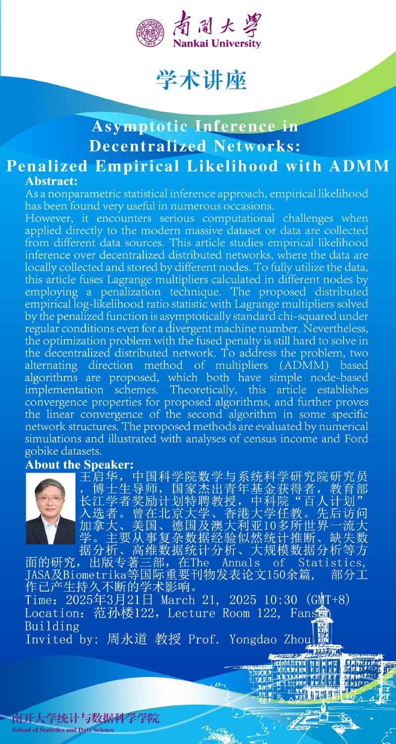 Asymptotic Inference in Decentralized Networks: Penalized Empirical Likelihood with ADMM(王启华)