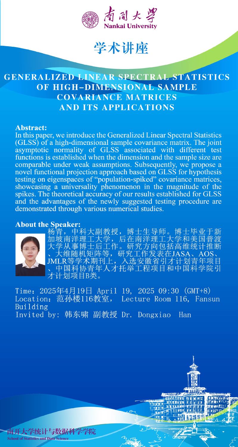 GENERALIZED LINEAR SPECTRAL STATISTICS OF HIGH-DIMENSIONAL SAMPLE COVARIANCE MATRICES AND ITS APPLICATIONS (杨青)