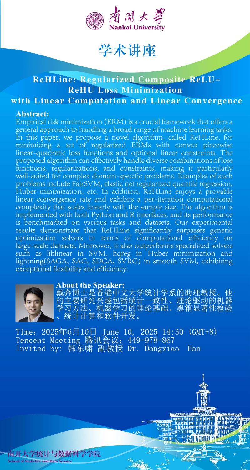 ReHLine: Regularized Composite ReLU-ReHU Loss Minimization with Linear Computation and Linear Convergence(戴奔)