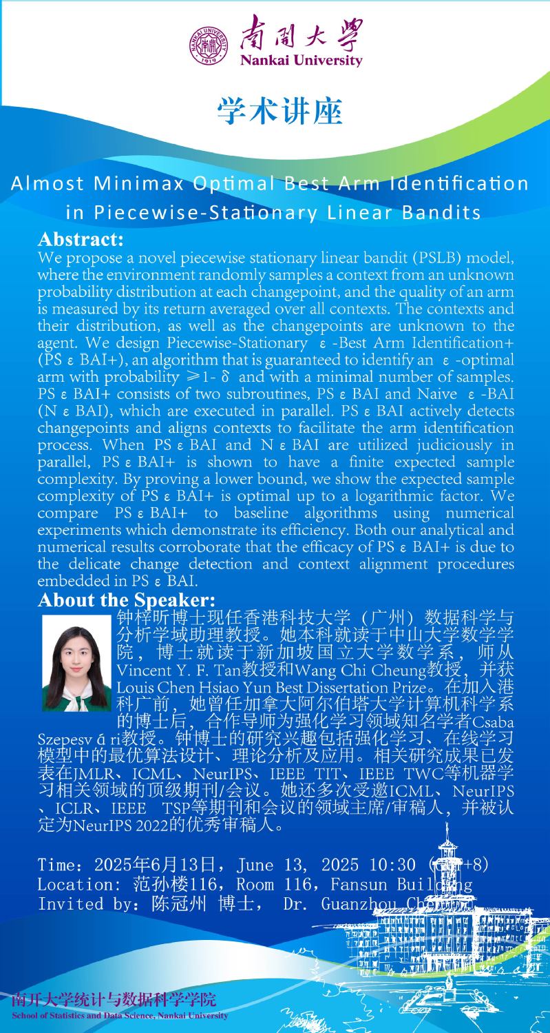 Almost Minimax Optimal Best Arm Identification in Piecewise-Stationary Linear Bandits(钟梓昕)