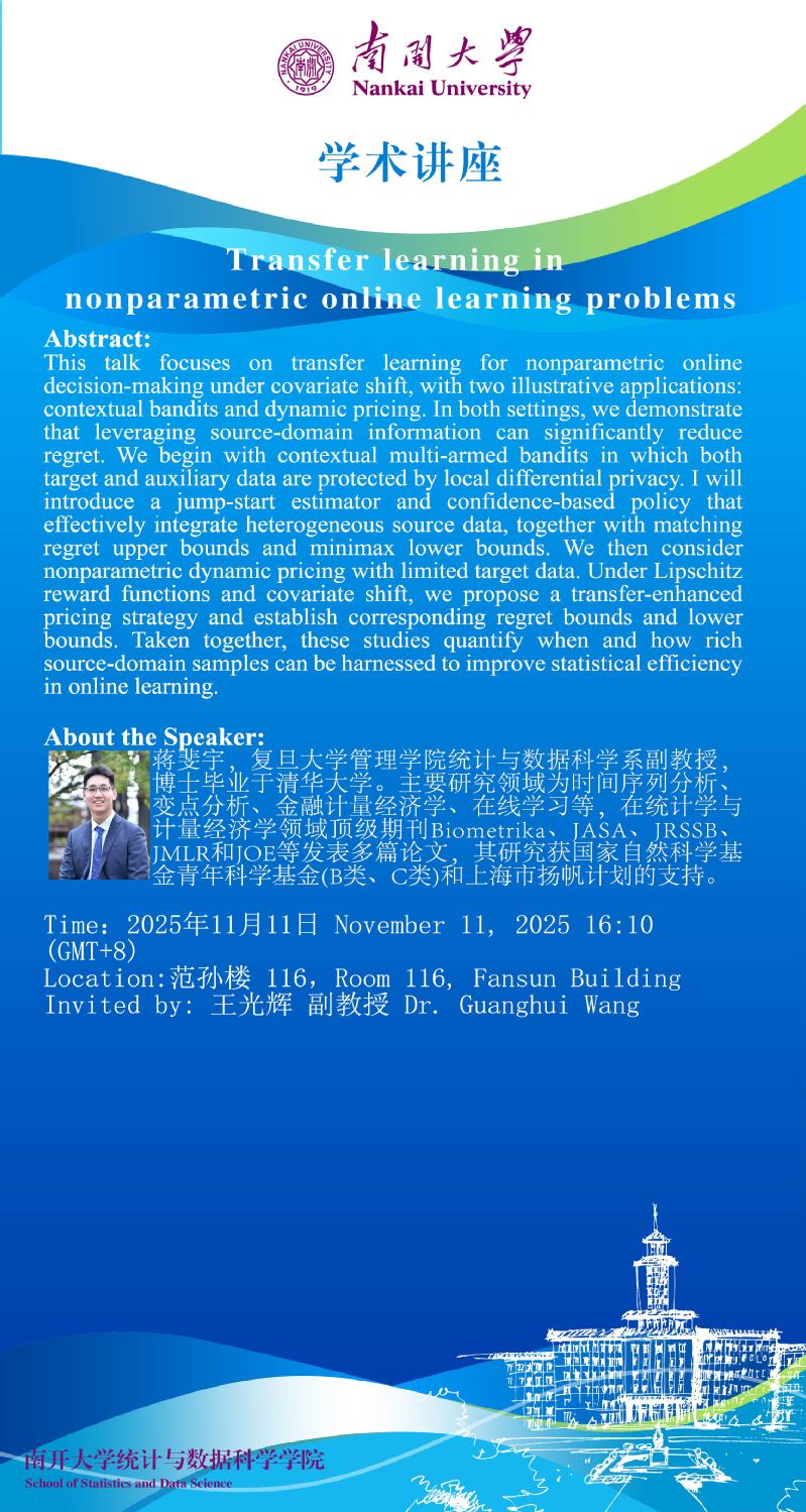 Transfer learning in nonparametric online learning problems(蒋斐宇)