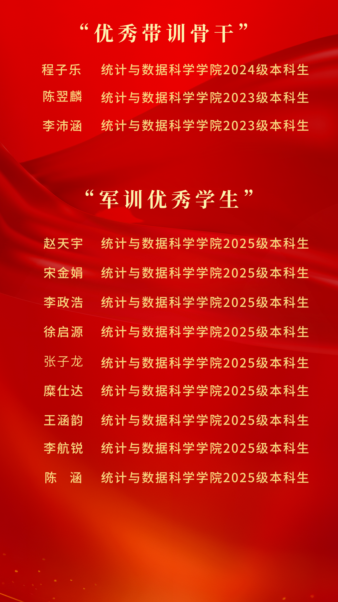 恭贺所有受表彰的集体与个人!新的一年,统计学院师生将珍惜荣誉、再接再厉,以受表彰的先进为标杆,传承发扬军训中锤炼的坚毅品格与纪律作风,坚定不移听党话、跟党走,在求学问道与实践奋斗中践行青春誓言、展现统计风采、贡献青春力量,奋力书写新时代青年挺膺担当、笃行不怠的成长篇章!