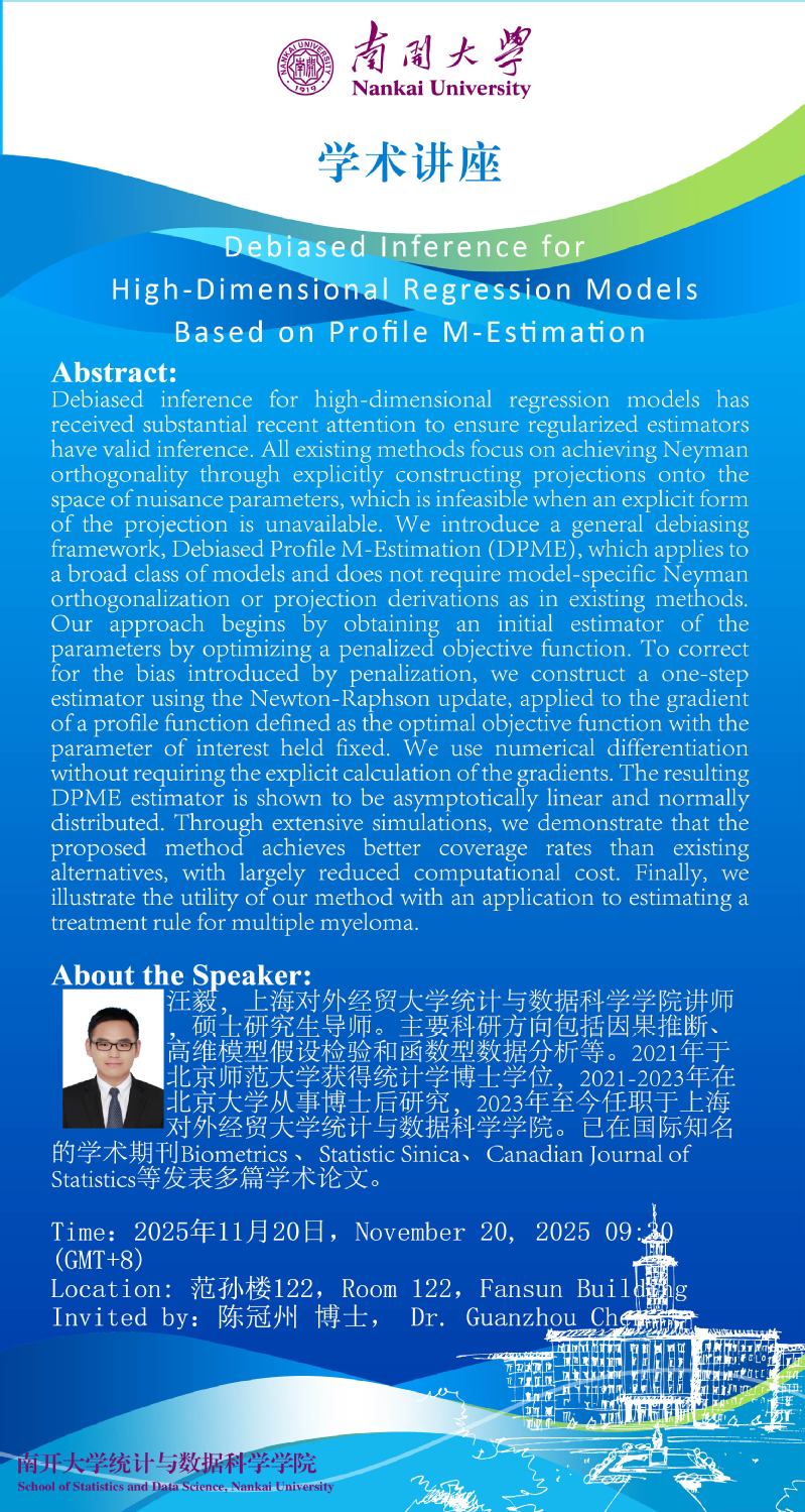 Debiased Inference for High-Dimensional Regression Models Based on Profile M-Estimation(汪毅)